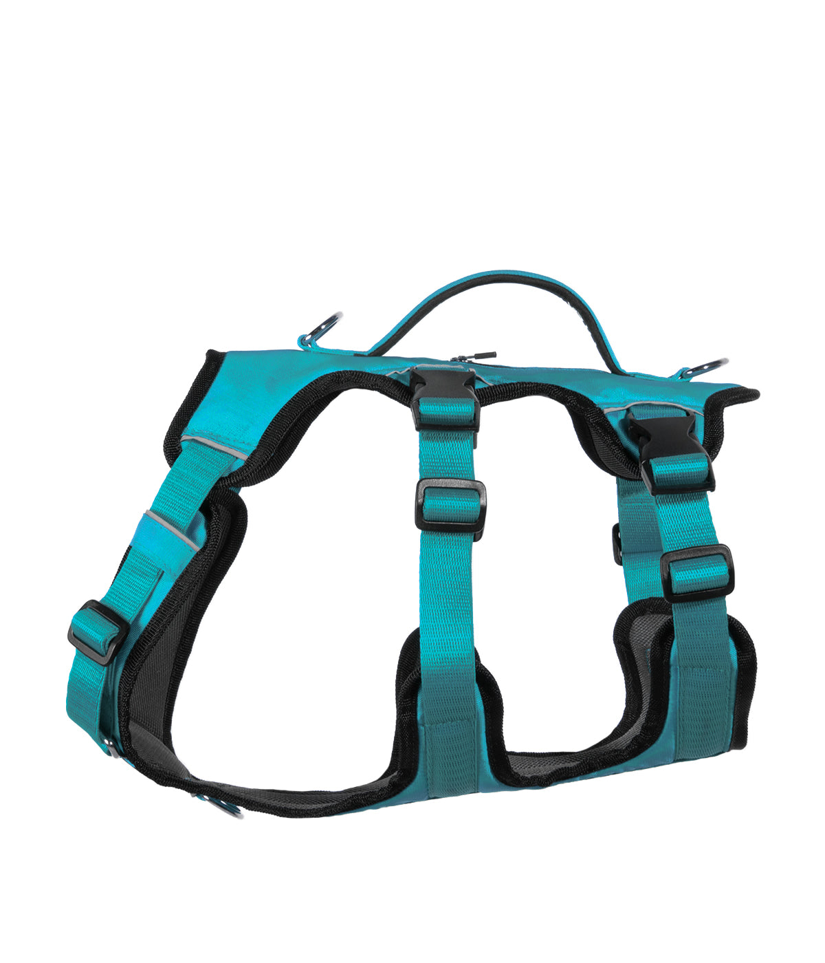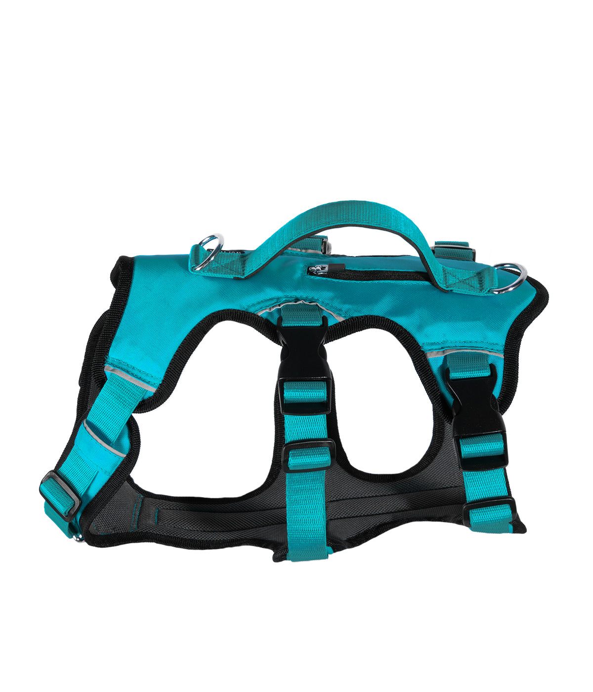 El arnés TrekRover 3 color turquesa une frescura y control para aventuras urbanas o de montaña. Con tres correas y seis puntos de ajuste, logra un ajuste exacto que libera la articulación del hombro y previene rozaduras. Su panel acolchado con espuma de celda cerrada y malla respirable mantiene el arnés estable y reduce la rotación en senderos. La manija superior facilita asistencias en escalones o rocas. Suma reflectivo 360°, hebillas de liberación rápida y bolsillo para placa/localizador. Hecho en poliéster resistente de secado rápido para uso intenso.