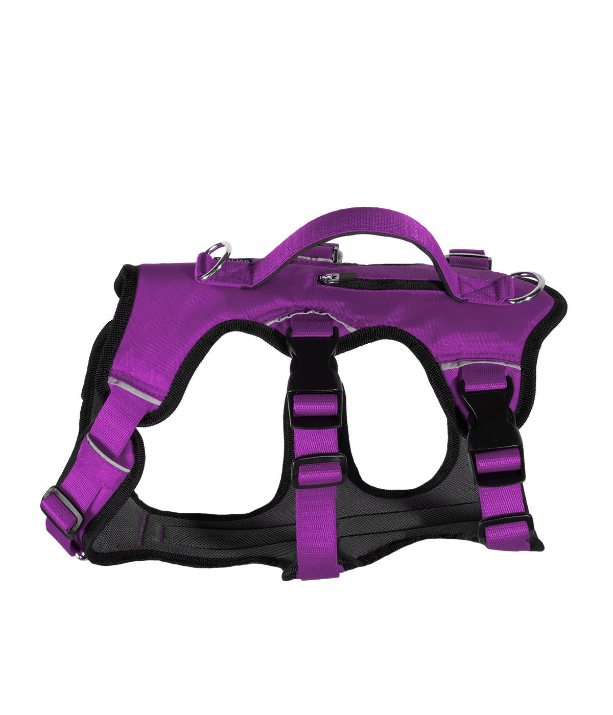 Para quienes buscan estilo y desempeño, el arnés TrekRover 3 color violeta ofrece control seguro en ciudad o montaña. Su chasis de tres correas y seis puntos de ajuste libera hombros y evita roces en axilas. El panel acolchado con espuma de celda cerrada y malla transpirable aporta confort y estabilidad antirrotación. La manija superior permite ayudar o elevar al perro en rampas o pasos técnicos. Incluye cinta reflectiva 360°, hebillas laterales rápidas y bolsillo para placa o localizador. Construcción en poliéster resistente, seca rápido y está hecha para durar.